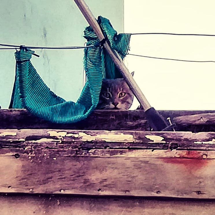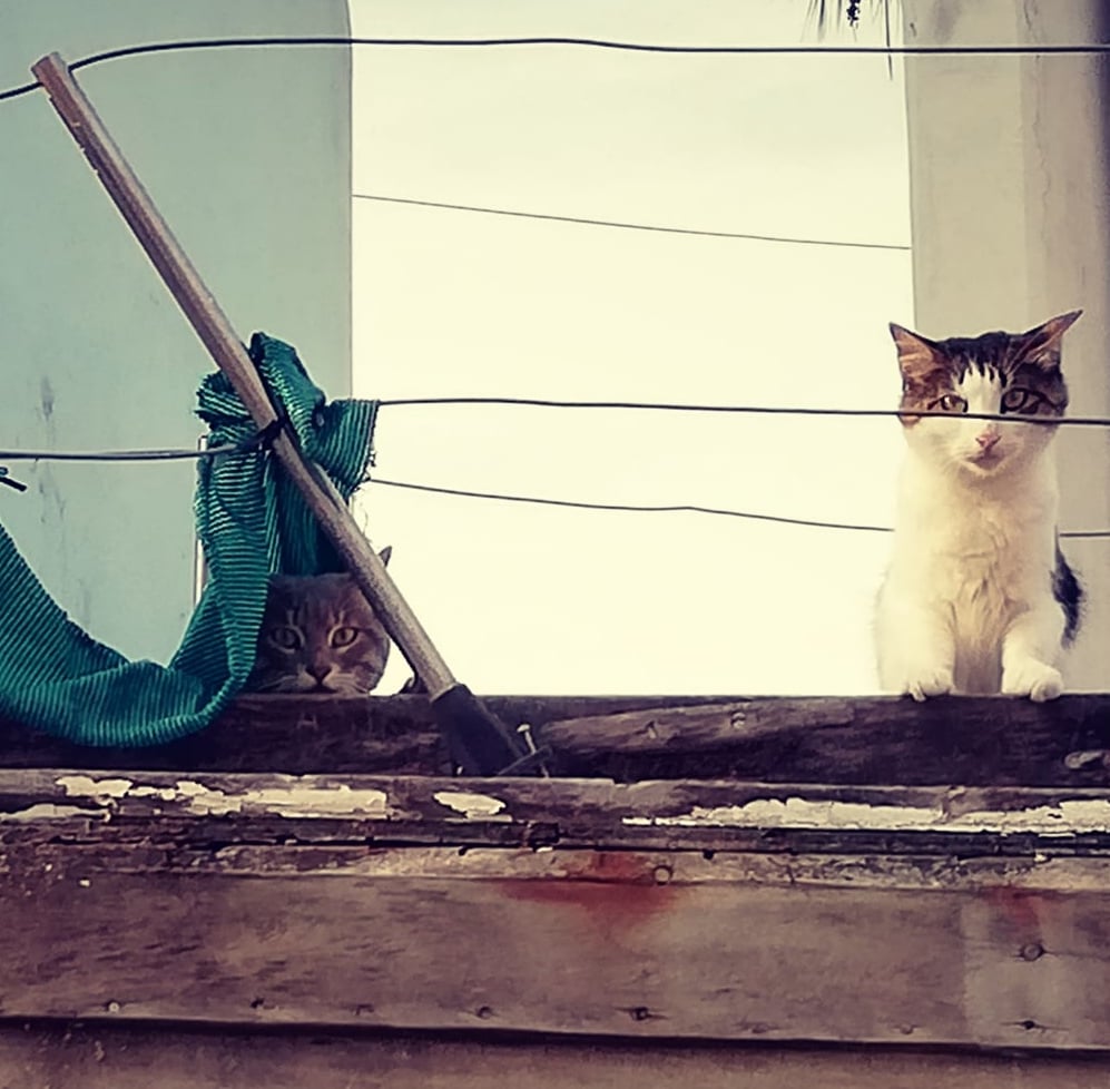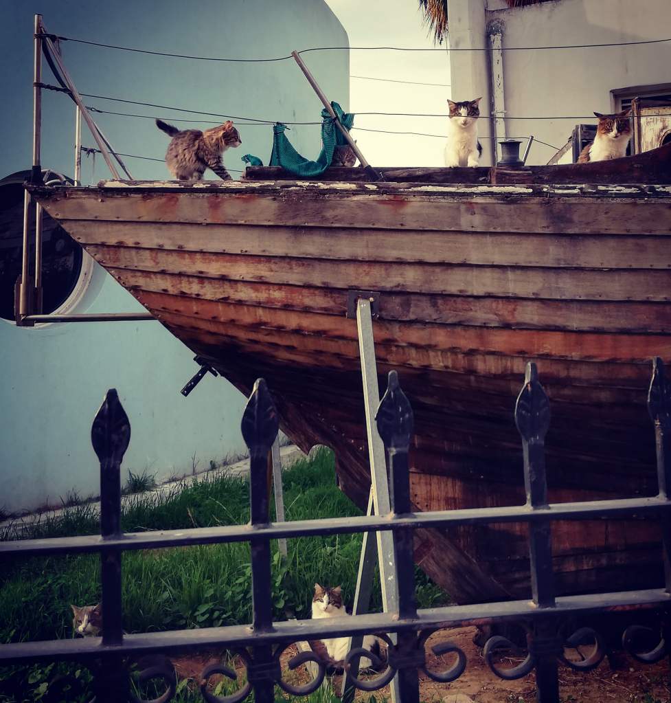 Κάθοδον προς το αυτοκίνητο, κοίταξα απέναντι και με έβλεπαν όλα τα γατιά, ένα ένα στη σειρά, μέσα σε ένα ξύλινο καράβι, που είναι τοποθετημένο εκεί κοντά στο γήπεδο.