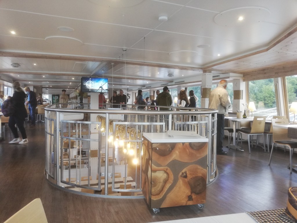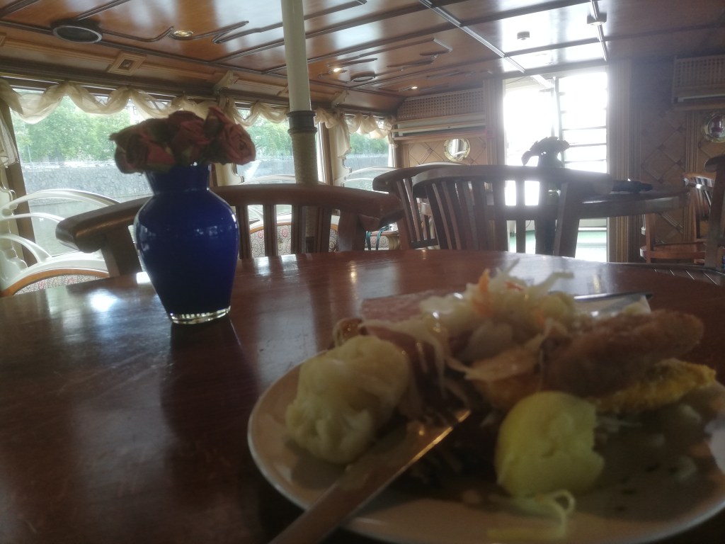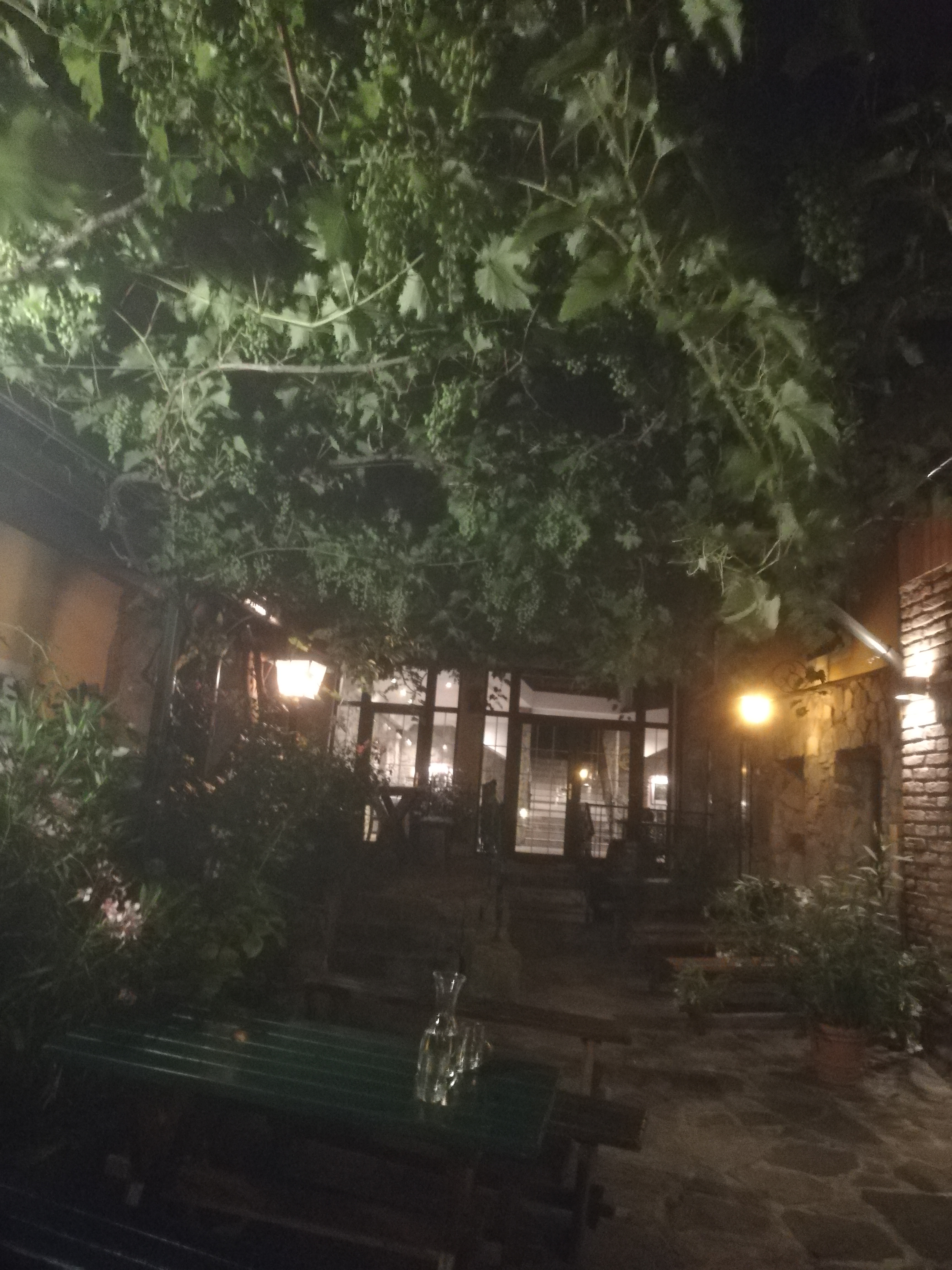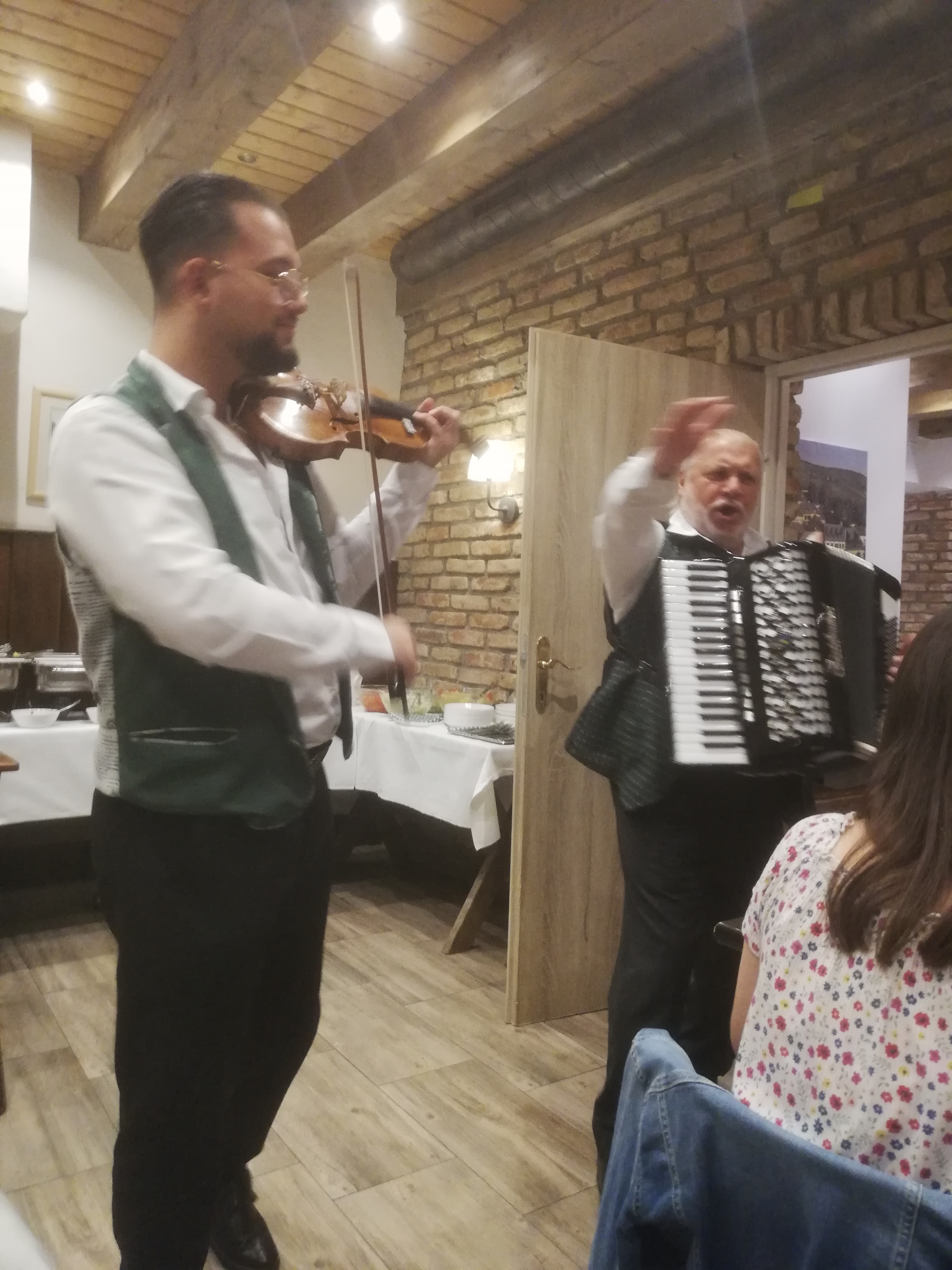 Δεν είδαμε τους αμπελώνες, μιας και νύχτωσε ήδη, αλλά φάγαμε σνίτσελ, λουκάνικα, από το μπουφέ και ακούσαμε ωραία μουσική από ακκορντεον και βιολί που παίζανε οι μουσικοί με τις παραδοσιακές τους στολές. Ακούσαμε και το τραγούδι “Τα παιδιά του Πειραιά”.