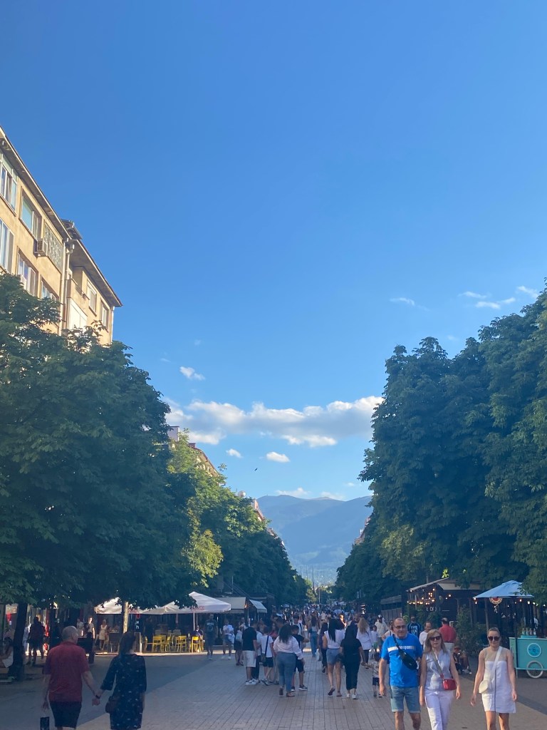 Στη λεωφόρο Βίτοσα με τα καταστήματα και με τις καφετέριες ήταν πολύ όμορφα . Ακόμα ένα βουνό φαινόταν στο βαθος . Το όρος Βίτοσα.
