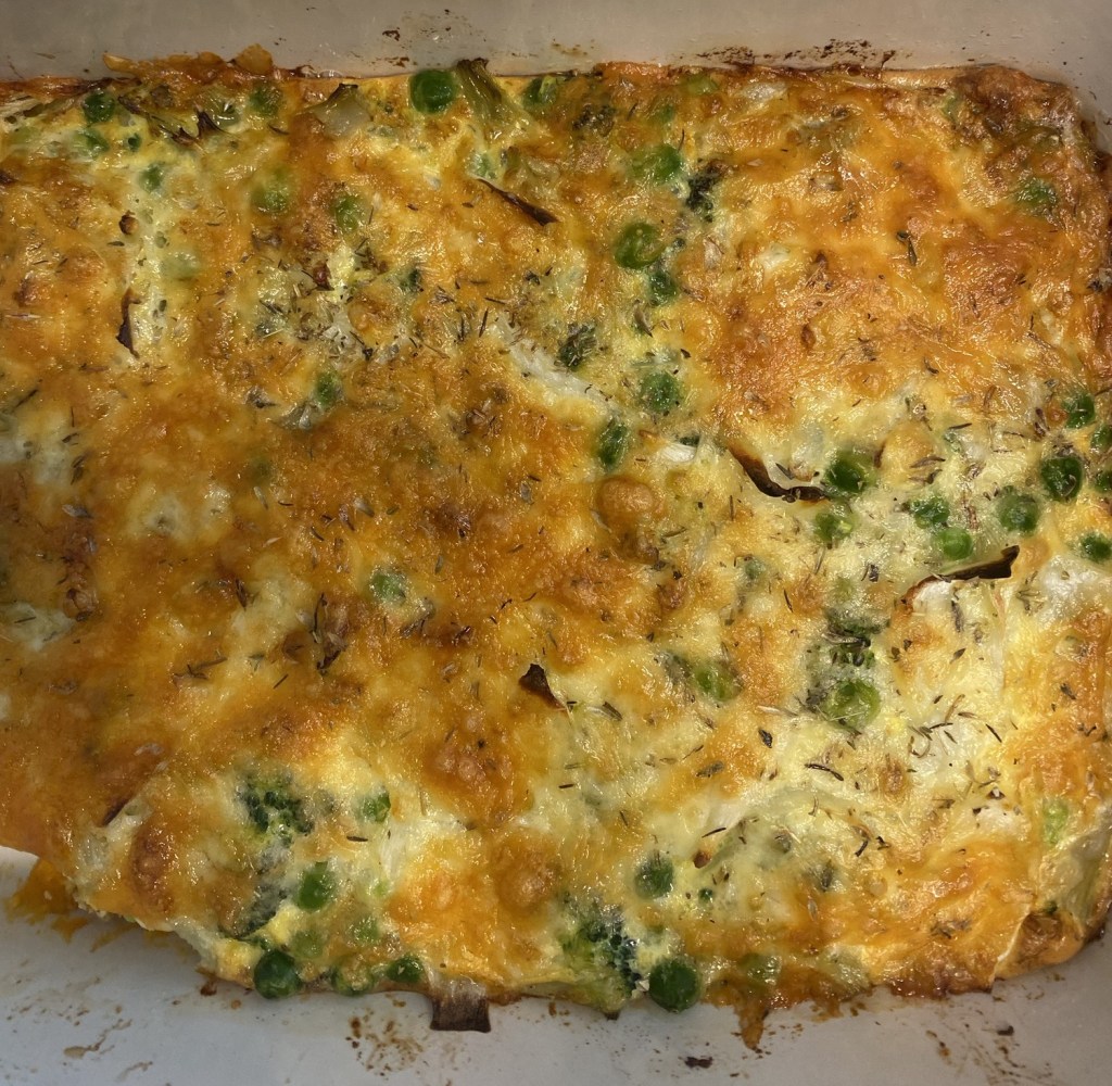 Ρίχνουμε μπρόκολα ( κατεψυγμένα ) σε ζεστό νερό για να ξεπαγώσουν. Και αφού τα κόψουμε κομματάκια τα ρίχνουμε πάνω απο την λιωμένη γλυκοπατάτα.
